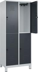 Doppelstöckiger Spind Classic PLUS, 2 Abteile mit je 2 Fächern, Abteilbreite 400 mm, Korpus aus stabiler Stahlkonstruktion mit hochwertiger Einbrennbeschichtung für hohe UV- und Korrosionsbeständigkeit, mit hinteren Belüftungsöffnungen oben und unten, innen je Fach 1 stabile Garderobenstange aus Ovalprofil mit 4 verdrehsicheren Doppel-Schiebehaken inkl. Systemaufnahme, Türöffnungen 110 Grad, Türaufhängung rechts, Stahl-Türen mit Soft-Anschlag und geschlossenen Seitenprofilen für hohe Stabilität, mit Lüftungskiemen oben und unten sowie eingestanztem Etikettenrahmen, Türaufhängung in stabilen Drehbolzen, 4 Ergonomische Sicherheits-Drehriegel für Vorhangschlösser mit Bügelstärke 6 bis 8 mm, inkl. Tür-Schutz, 100 mm hohe Füße aus Kunststoff für erweiterten Korrosionsschutz, Maße (H x B x T): 1950 x 800 x 500 mm, Korpus: RAL 7035 Lichtgrau, Türen Stahl: RAL 7016 Anthrazitgrau, Füße: RAL 7035 Lichtgrau