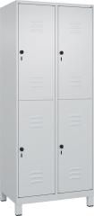 Doppelstöckiger Spind Classic PLUS, 2 Abteile mit je 2 Fächern, Abteilbreite 400 mm, Korpus aus stabiler Stahlkonstruktion mit hochwertiger Einbrennbeschichtung für hohe UV- und Korrosionsbeständigkeit, mit hinteren Belüftungsöffnungen oben und unten, innen je Fach 1 stabile Garderobenstange aus Ovalprofil mit 4 verdrehsicheren Doppel-Schiebehaken inkl. Systemaufnahme, Türaufhängung rechts, Stahl-Türen mit Soft-Anschlag und geschlossenen Seitenprofilen für hohe Stabilität, mit Lüftungskiemen oben und unten sowie eingestanztem Etikettenrahmen, Türaufhängung in stabilen Drehbolzen, Türöffnungen 110 Grad, 4 Ergonomische Sicherheits-Drehriegel für Vorhangschlösser mit Bügelstärke 6 bis 8 mm, inkl. Tür-Schutz, 100 mm hohe Füße aus Kunststoff für erweiterten Korrosionsschutz, Maße (H x B x T): 1950 x 800 x 500 mm, Korpus: RAL 7035 Lichtgrau, Türen Stahl: RAL 7035 Lichtgrau, Füße: RAL 7035 Lichtgrau