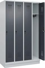 Garderobenschrank Evolo PLUS mit Sockel Korpus: • Stabile Stahlkonstruktion mit hochwertiger Einbrennbeschichtung • Hohe UV- und Korrosionsbeständigkeit • Aufbruchgeschützte Konstruktion gemäß höchster Stufe C nach DIN 4547-2 • Mit hinteren Belüftungsöffnungen oben und unten • Lichte Abteil-Durchlassbreite: 240/340 mm • Sockel: Höhe 100 mm, aus Kunststoff Türen: • Mit Soft-Anschlag • Rechts angeschlagen • Extrem verwindungssteif • Türöffnungsbegrenzer: 90 Grad (als Schutz vor Überdehnen der Tür) • Mit Kunststoff-Etikettenrahmen: schwarz, selbstklebend, inkl. Klarsicht-Kunststoff-Abdeckung und weißem Etikett zur individuellen Beschriftung • Sicherheits-Drehriegelverschluss: für Vorhängeschloss (ergonomisch geformt, dreht in geschlossenem Zustand durch und verhindert damit das Aufbrechen durch Überdrehen) Innenausstattung: • Pro Abteil 1 fest verschweißter Ablageboden, darunter stabile Garderobenstange mit 3 verdrehsicheren Doppel-Schiebehaken (Traglast pro Stange 40 kg, pro Doppelhaken 15 kg) Hinweis: Weitere Farben für Korpus und Türen auf Anfrage lieferbar. Hersteller: C+P Möbelsysteme GmbH & Co. KG, Boxbachstr.1, 35236 Breidenbach, DE, +4964659190, info@cpmoebel.de