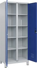 Wäsche-Spind Classic PLUS, 2 Abteile für 1 Person, Abteilbreite 400 mm, Korpus aus stabiler Stahlkonstruktion mit hochwertiger Einbrennbeschichtung für hohe UV- und Korrosionsbeständigkeit, mit hinteren Belüftungsöffnungen oben und unten, innen je Abteil 4 Fachböden, Türen zueinanderschlagend für gemeinsamen Verschluss, Türöffnungen 110 Grad, Stahl-Türen mit Soft-Anschlag und geschlossenen Seitenprofilen für hohe Stabilität, mit Lüftungskiemen oben und unten sowie eingestanztem Etikettenrahmen, Türaufhängung in stabilen Drehbolzen, 1 Ergonomische Sicherheits-Drehriegel für Vorhangschloss mit Bügelstärke 6 bis 8 mm, inkl. Tür-Schutz, 100 mm hohe Füße aus Kunststoff für erweiterten Korrosionsschutz, Maße (H x B x T): 1950 x 800 x 500 mm, Korpus: RAL 7035 Lichtgrau, Türen Stahl: RAL 5010 Enzianblau, Füße: RAL 7035 Lichtgrau
