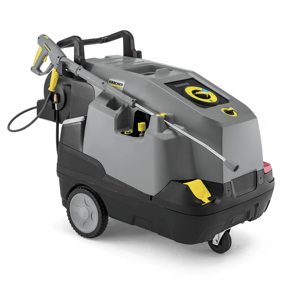 Leistungsstarker 3-Phasen-Heißwasser-Hochdruckreiniger der Kompaktklasse mit automatischer Schlauchtrommel: Der HDS 7/16 CXA verfügt über einen leistungsstarken luftgekühlten Motor mit eco!efficiency-Stufe. Eine robuste Axialpumpe mit drei Keramikkolben baut hohen Druck auf. Die automatische Trommel zum Auf- und Abrollen des 15 Meter langen Ultra Guard-Hochdruckschlauchs mit Teflon®-Beschichtung auch unter Druck sorgt für hohen Komfort und kurze Rüstzeiten. Die EASY!Force Advanced-Hochdruckpistole mit patentierter Düsentechnologie und EASY!Lock-Schnellverschlüssen ermöglichen ergonomisches Arbeiten. Das Soft Damping System (SDS) reduziert Vibrationen. Die Heißwassertechnologie löst selbst Schmierstoffe effektiv auf und reduziert den Einsatz von Reinigungsmitteln, die aus einem 15,5-Liter-Tank präzise dosiert werden. Druck und Wassermenge lassen sich je nach Aufgabe anpassen. Der wartungsfreundliche HDS 7/16 CXA ist für den täglichen Einsatz unter harten Bedingungen konzipiert. Die Entkalkungsoption, ein Wasserfilter und ein Sicherheitsventil schützen die Technik. Ein robustes Fahrgestell schützt vor Stößen, große Räder und eine Lenkrolle sorgen für hohe Wendigkeit.