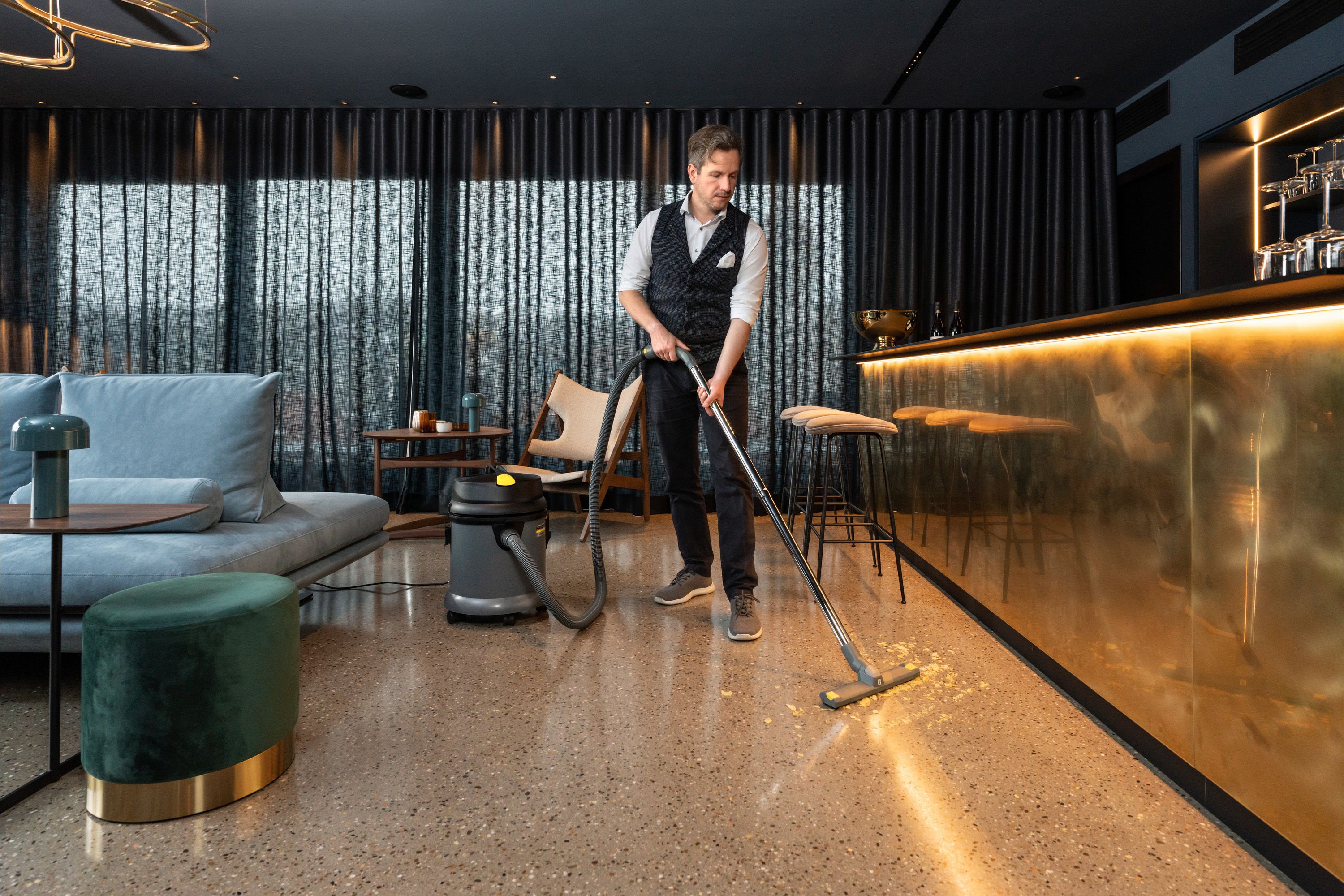 Der NT 27/1 Advanced ist ein kompakter, wendiger und besonders bedienungsfreundlicher Nass-/Trockensauger für den universellen gewerblichen Einsatz. Die enorme Saugleistung des NT 27/1 Advanced ist auf seine leistungsstarke Saugturbine zurückzuführen. Ausgestattet ist er mit einem Patronenfilter. Eine mechanische Schwimmerabschaltung bei Erreichen der maximalen Füllhöhe sorgt für eine erhöhte Lebensdauer und schonenderes Arbeiten. Das praktische Clip-System zum schnellen Wechsel bzw. Anschluss des Zubehörs ermöglicht eine unkomplizierte Handhabung. Fünf Lenkrollen sorgen für leichten Nachlauf, Wendigkeit und sicheren Stand. Außerdem besitzt der NT 27/1 Advanced eine praktische Ablagefläche auf dem Gebläsekopf welcher, wie auch das Gehäuse, aus schlagfestem Kunststoff gefertigt ist. Ein weiterer Pluspunkt des NT 27/1 Advanced ist die Zubehörhalterung und der Kabelhaken am Gerät. Der ergonomische Tragegriff mit Saugrohraufnahme garantiert einen einfachen und bequemen Transport des Geräts mit dem gesamten Zubehör. Der NT 27/1 Advanced besitzt einen rundum laufenden Rammschutz, der nicht nur das Gerät, sondern auch Wände, Maschinen und Einrichtungsgegenstände vor Beschädigungen schützt.