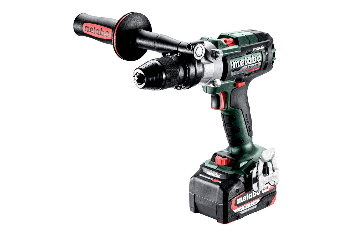 Schnellspannbohrfutter Futuro Top, Zusatzhandgriff, Hakenschlüssel, 2 Li-Power Akkupacks (18 V/5,2 Ah), Ladegerät ASC 55 "AIR COOLED", metaBOX 145 L