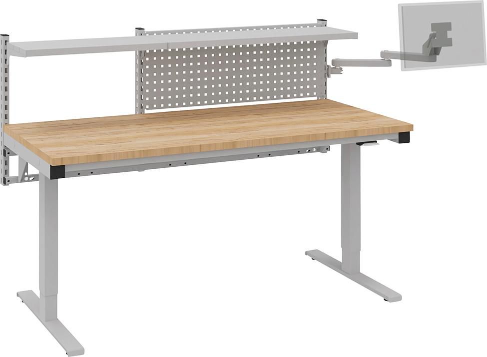 Systemtisch Multi2move Typ 83 • Buche-Multiplex-Platte, 30 mm dick, Oberfläche geölt • Elektrisch höhenverstellbar durch Handtaster mit digitaler Höhenanzeige • Tischgestell: ESD lichtgrau Aufbau: • Tischaufbauset: 3 Säulen • 2 Lamellenböden 321 mm (1x 1000 mm+ 1x 655 mm breit bzw. 2x 1000 mm breit) • 1 Quadratloch-Rückwand 1000 x 380 mm • 1 TFT-Schwenkarm