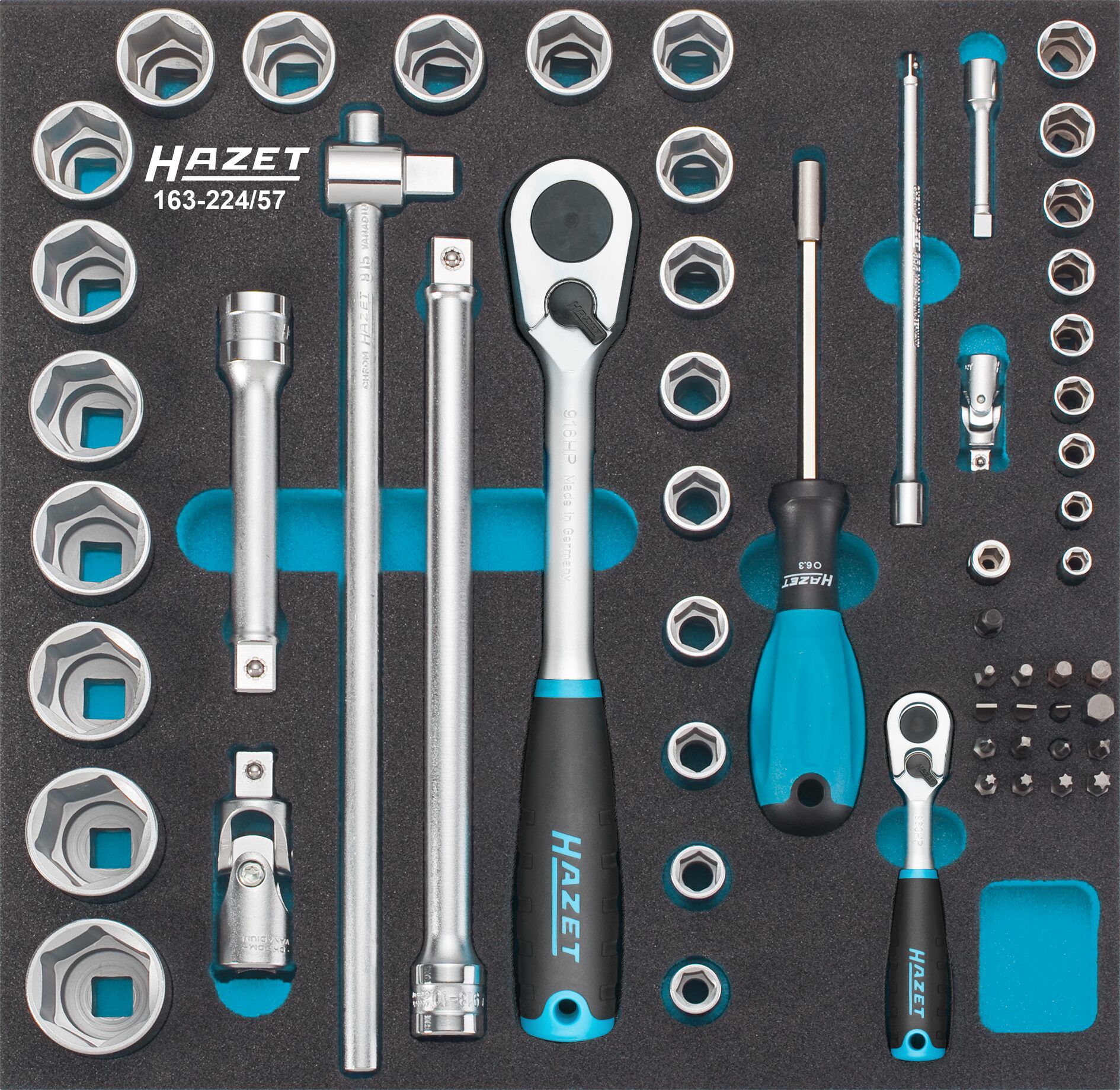 Tool module socket wrench 1/4" and 1/2", 57-pc, module 2/3 Design: 2-colour foam inlay, so missing tools are recognised immediately. 1/3 module = 172 x 342 mm 2/3 module = 344 x 342 mm 3/3 module = 519 x 342 mm 3/3+ module = 519 x 392 mm Note: Suitable for Hazet roller cabinet, for model 179 using a spacer module. Suitable for Hazet rolling workbench. Socket wrench set 1/4" and 1/2", 57-pc 1 reversible ratchet 1/4" 9 hexagon socket wrench sockets 1/4" 5.5; 6; 7; 8; 9; 10; 11; 12; 13 mm 2 extensions 1/4" 55; 147 mm 1 universal joint 1/4" 1 bit hand holder 1/4" 5 recessed hexagon bits 1/4" 3; 4; 5; 6; 8 mm 3 slot bits 1/4" 4.5; 6; 6.5 mm 2 Phillips bits 1/4" PH 1; 3 2 Phillips bits 1/4" PZ 1; 2 4 recessed TORX® bits 1/4" T 15; 20; 25; 30 1 reversible ratchet 1/2" 20 hexagon socket wrench set 1/2" 10; 11; 12; 13; 14; 15; 16; 17; 18; 19; 20; 21; 22; 23; 24; 26; 27; 28; 30; 32 mm 1 T-handle with sliding block 1/2" 2 extensions 1/2" 123; 248 mm 1 universal joint 1/2" 1 connection part 1/4" recessed square to 1/4" recessed hexagon 1 connector from 1/4" protruding hexagon to 1/4" protruding square